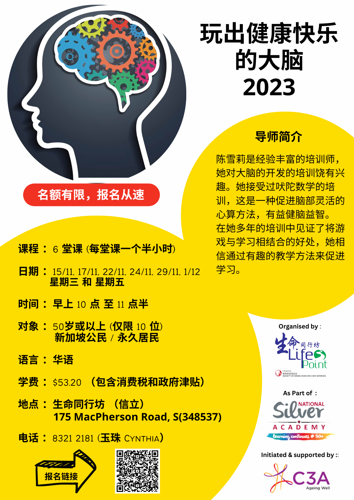 快来参加11月份的“玩出健康快乐的大脑”课程,通过不同的游戏,锻炼您的大脑。